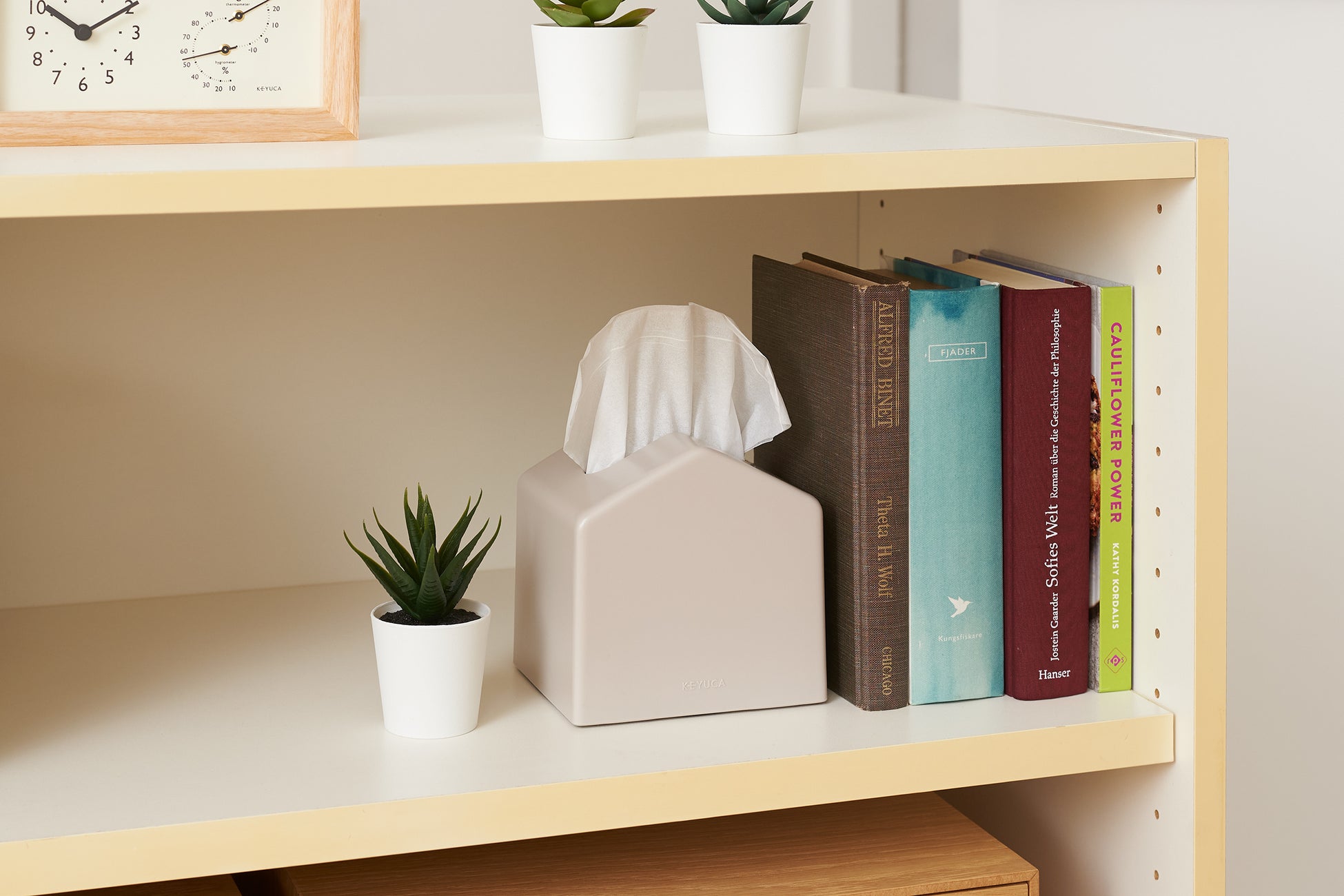 通常のティッシュボックスは幅が約250mm程度あるのに対し、KEYUCAの「コンパクトティッシュケース」は幅が約140mmとコンパクト。省スペースで使えるため、スペースに余裕のない場所でもスッキリと収まります。