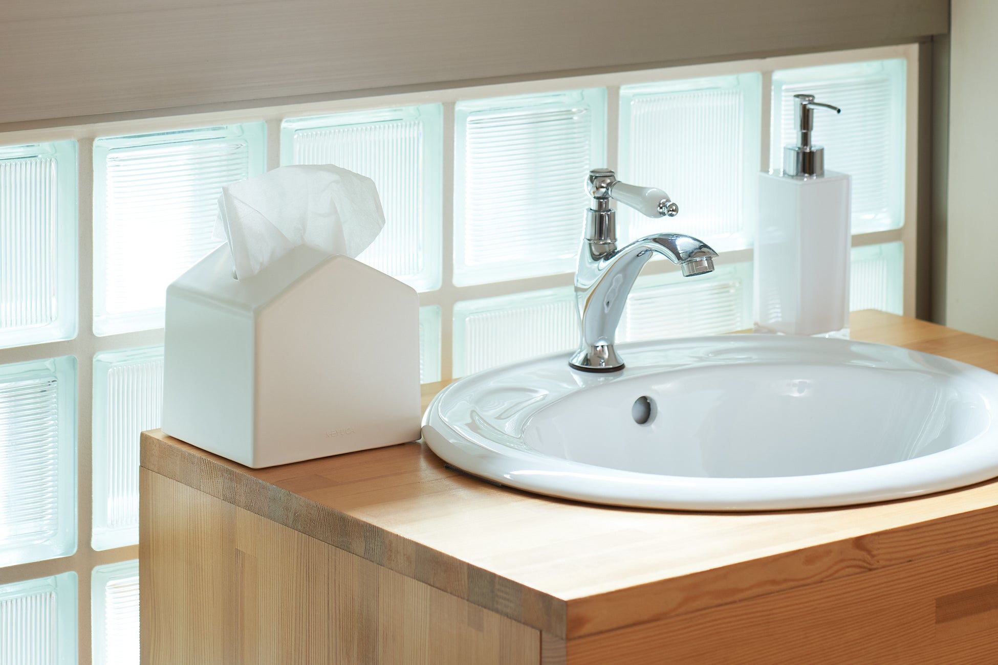 一般的なサイズのティッシュペーパーを箱から出し、二つ折りにして乗せ、上から本体を被せるだけ。容量はそのままに省スペースでコンパクト。分かりやすい動作で簡単に詰め替えができるように工夫しました。
