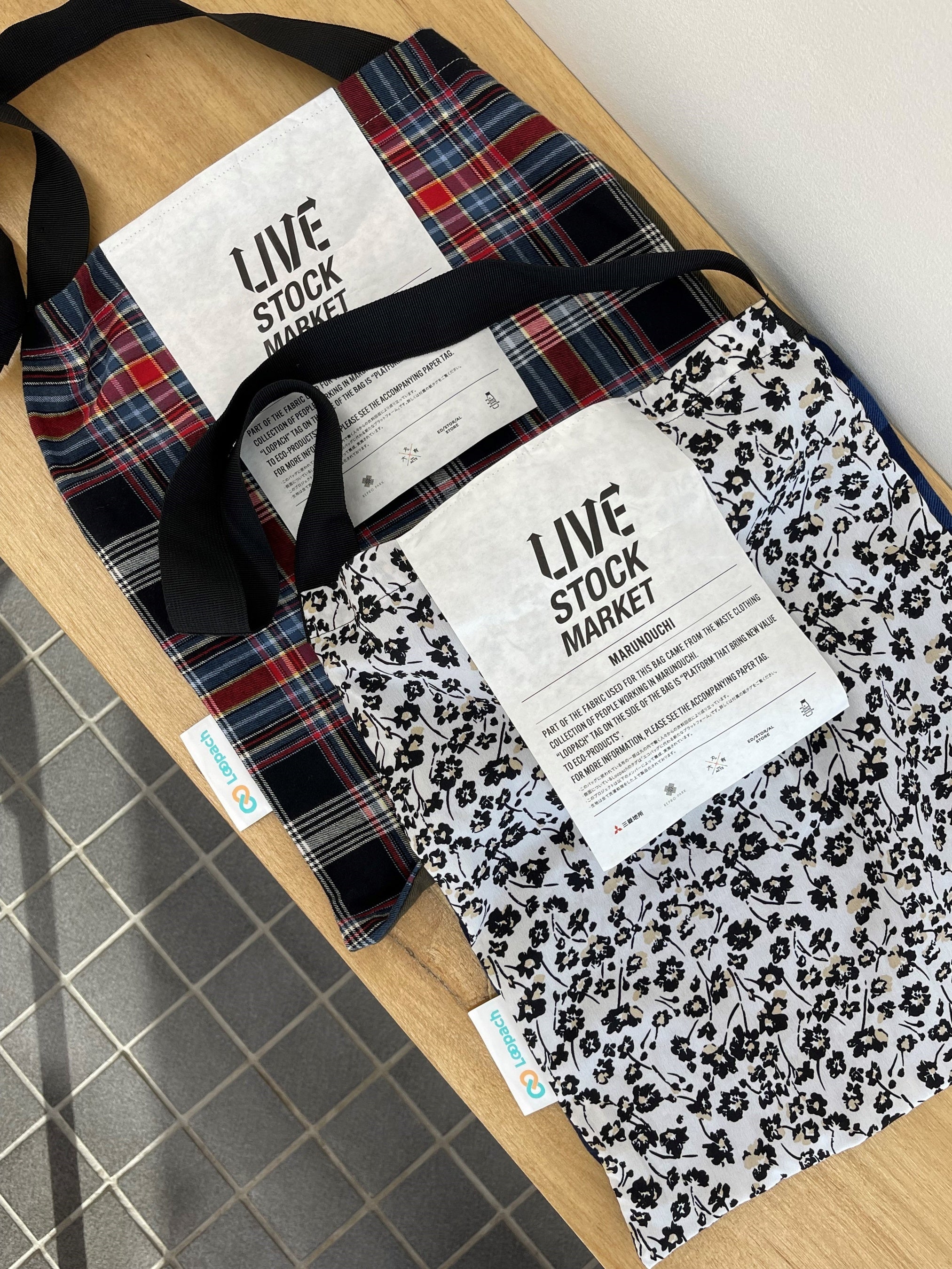イベント期間中、「LIVE STOCK POP UP」の参加店舗、3店舗にご来店いただき、各店で配布しているステッカーを3枚集め、丸ビル1階マルキューブで開催中の「EDISTORIAL STORE」特設POP UP へお持ちいただいた方に、大丸有SDGs ACT5を通じて丸の内エリアのワーカーから回収したアパレル製品の一部をアップサイクルして作ったトートバック「RECYCLE WEAR BAG」をプレゼント。プレゼントは「EDISTORIAL STORE」特設POP UP内で配布いたします。