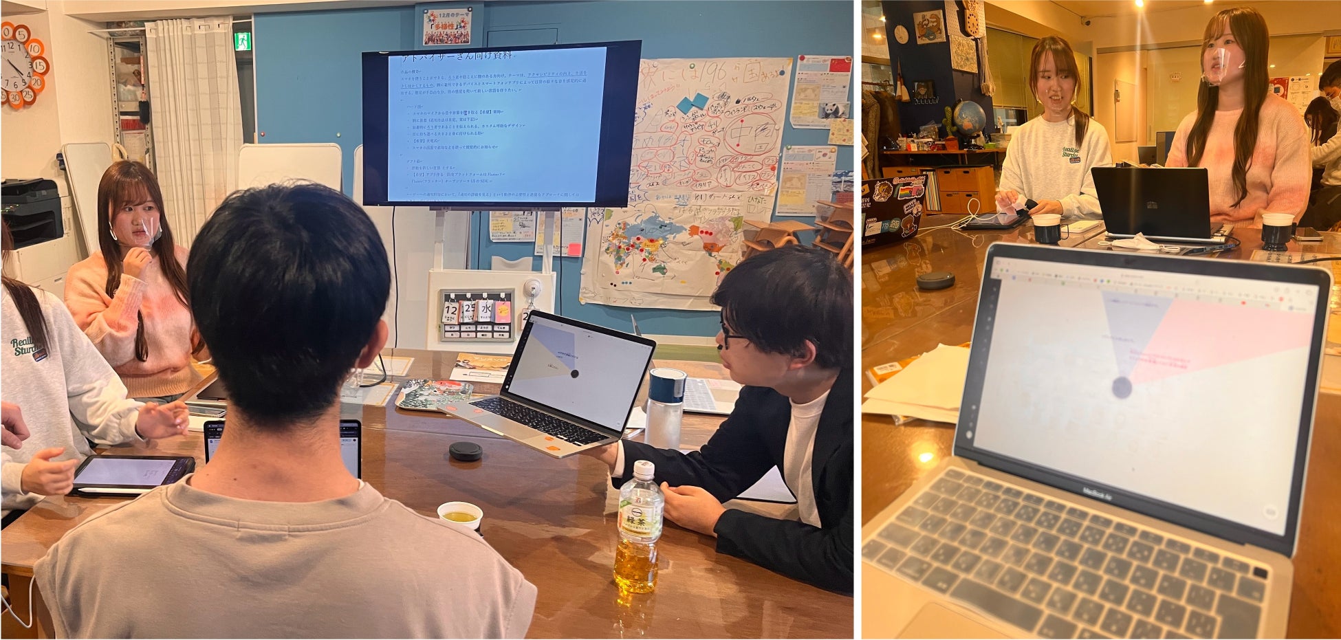 ①サイレントボイスを中心に「雑談の見える化」に焦点を当てた実証実験を実施。常設した VUEVO(ビューボ)を通じて、コミュニティへの参加意識の変化を定性・定量的に検証