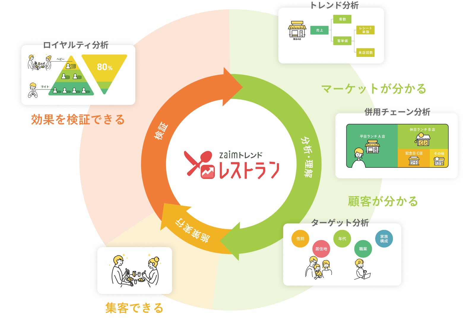 くふうカンパニーグループにおいて、1,000 万ダウンロードを超える個人向け家計簿サービス「Zaim」を運営する株式会社 Zaim(本社:東京都渋谷区、代表取締役:閑歳孝子)は 12 月 21 日、オンライン家計簿サービス「Zaim」に集まる購買ビッグデータから、外食チェーンの市場動向、各チェーンの利用者数・客単価といった指標、利用者属性及び行動などを可視化できるZaim トレンド シリーズの第一弾として「Zaim トレンド for レストラン」の提供を開始しました。