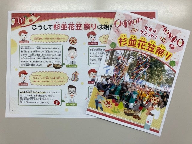 サミットが1990年に花笠祭りを始めた理由、過去のお祭りの様子、いも煮の作り方、クイズ、店舗でのイベントの内容などを全10ページで紹介する冊子を店頭で配布します。