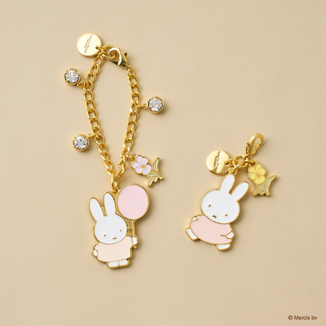 風船を持っているミッフィーと、お散歩姿のミッフィーをモチーフにしたファスナートップとバッグチャーム。