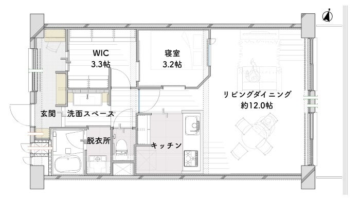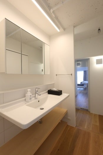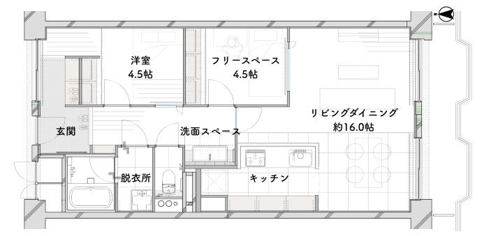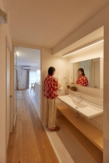 対面キッチンは二人がすれ違える広さで、キッチン横の寝室は角を取ることで、キッチンからリビングの様子も見渡せます。WICはワークスペースとしても活用でき、寝室→WIC→脱衣室(洗濯機置き場)がスムーズにつながる家事動線を確保。玄関とWICが隣接しているため、帰宅後すぐに上着や荷物を片付けられる動線が実現しています。洗面は廊下に設け、帰宅後すぐに使える配置にしました。玄関は広く、自転車や趣味のスペースとしても活用できます。