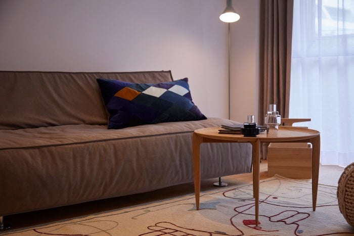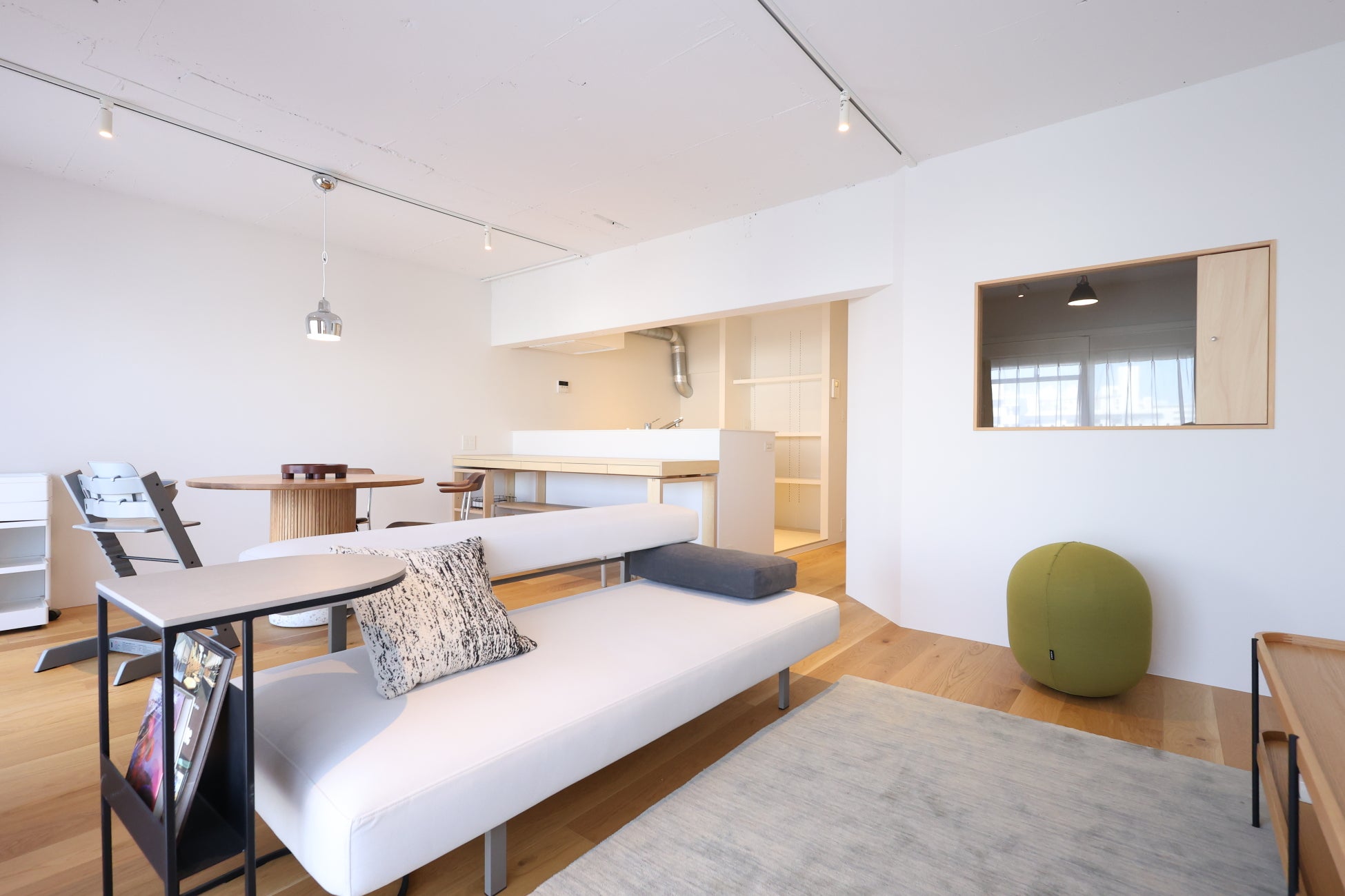 インテリアは暮らしに長く寄り添えるモノを提案するライフスタイルショップ「SEMPRE」が担当。白を基調に北欧家具を配したシンプルで上質な空間が特徴です。リビングには、背もたれを外せばデイベッドとしても使える「SO-11 ソフトキューブソファ」や、ラタンの「ハイバックチェア」を配置し、家族の居場所をつくりました。Fritz HansenのトレイテーブルやLouis Poulsenのポータブルランプなど、軽やかに動かせる家具や照明が、暮らしの自由度を広げます。スペインNanimarquinaのラグは、空間にアートのような彩りを加えました。