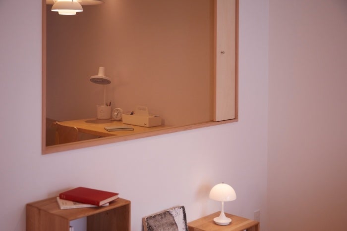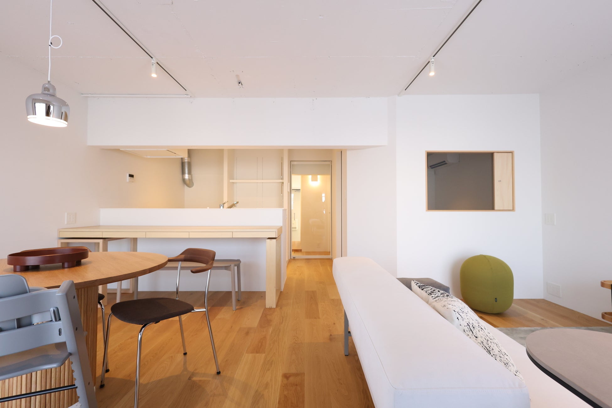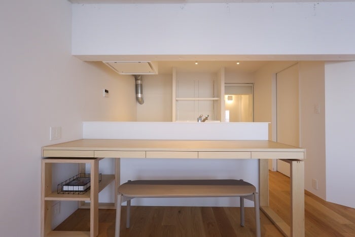 LDKには、リブ支柱が印象的なmoda en casaのテーブルや、マルニ木工のhiroshimaを配置。ソファはSEMPREの「SO-01 フローティングソファ」を採用しました。造作家具は住宅仕様と同じシナ材で統一。本コンセプトルームでは2種類用意しました。1つ目はダイニングにも作業にも使えるキッチンカウンター。2つ目は玄関土間のデスクで、柱の形に沿った設計で、スペースを無駄なく活用。ワークスペースや趣味の作業場として活用できます。椅子はAMAのヴィンテージの「Machinist chair」を配置しバランスを取りました。照明やテーブルの脚など、アクセントにシルバーのラインを取り入れ、軽やかで引き締まった印象に。全体を通して「生活の景色」が浮かぶようなアイテムをセレクトしています。リノベる。のインテリアコーディネートでは、お客さまの暮らしを丁寧にヒアリングし、既製品も造作も、最適な組み合わせを提案しています。