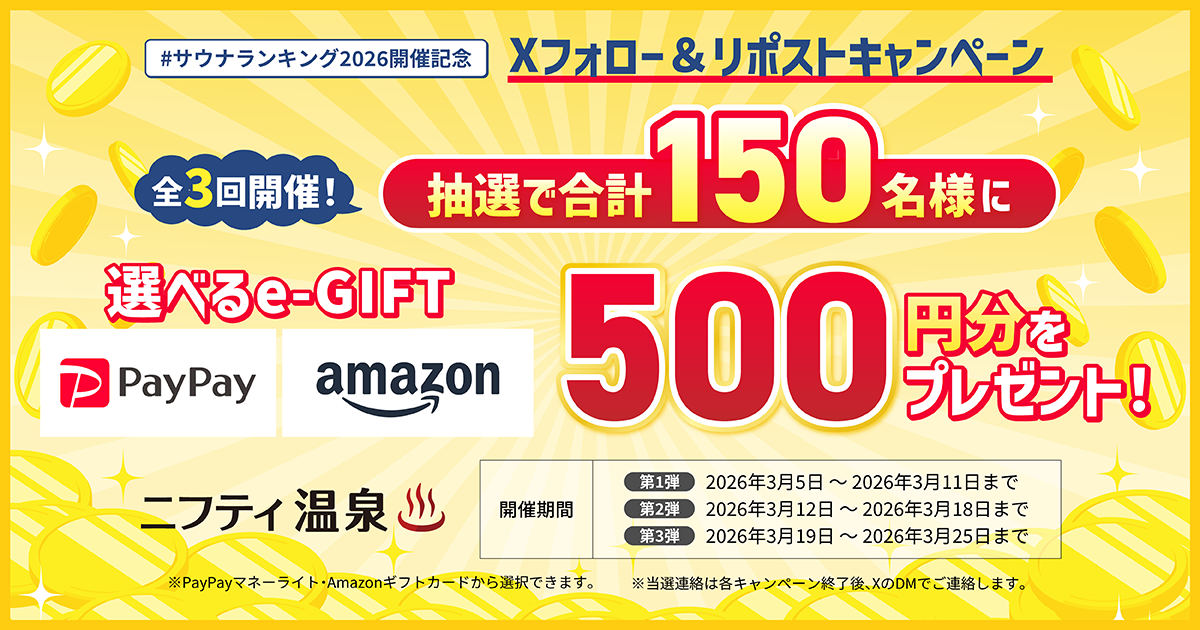 ニフティ温泉サウナランキング2026の公開を記念して、Xにてフォロー&リポストキャンペーンを開催予定です。