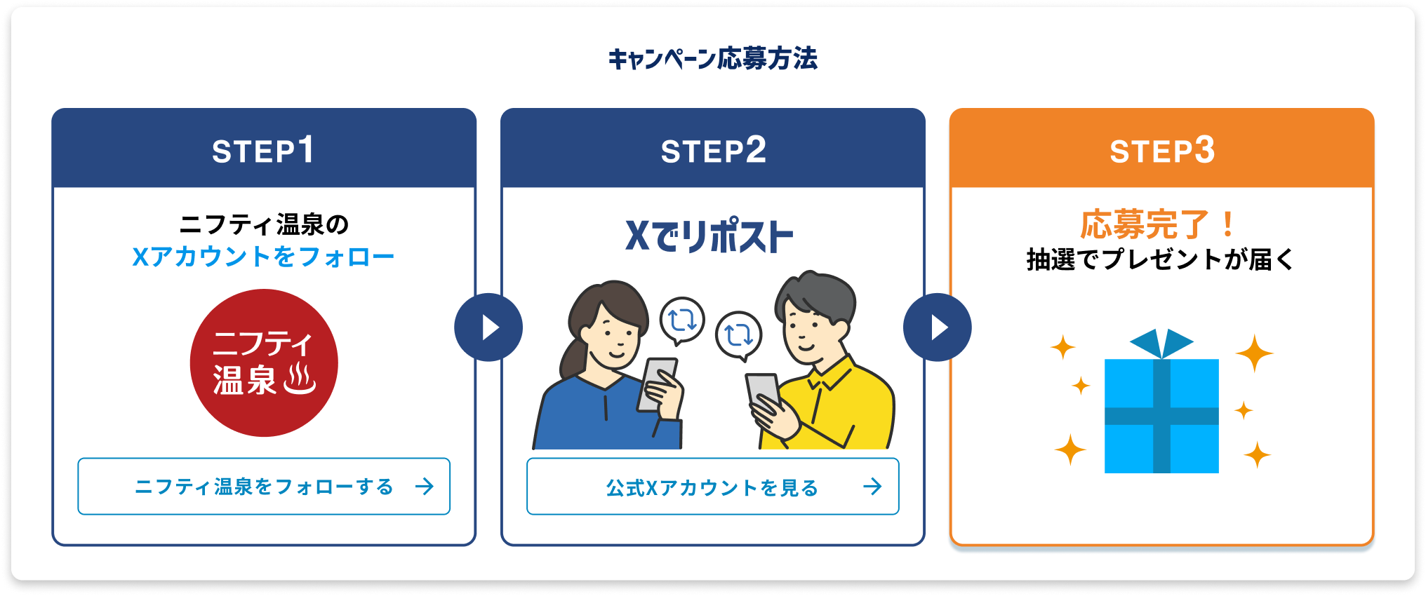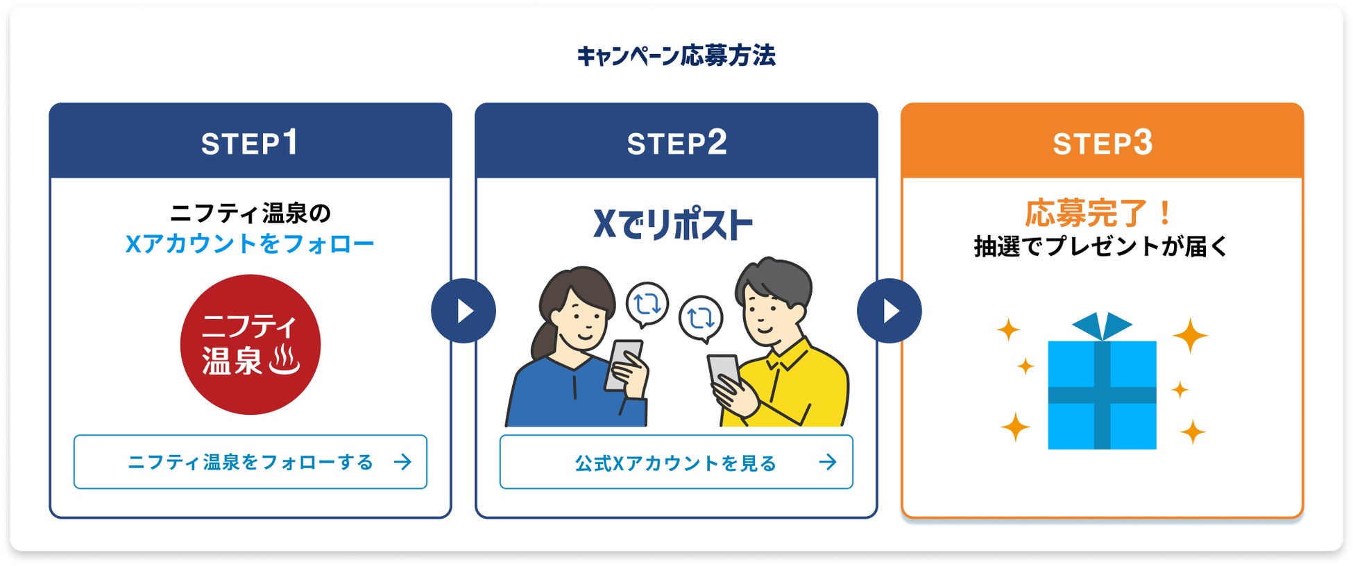 キャンペーン期間中にニフティ温泉のX公式アカウント(@niftyonsen)をフォローし、対象のキャンペーン投稿をリポストした方の中から抽選で合計150名様に選べるe-GIFT500円分をプレゼントいたしす。
