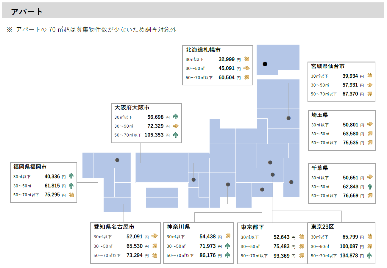 - アパートは、神奈川県・千葉県が全面積帯で前年同月を上回る。特に神奈川県は、2カ月連続全面積帯で前年同月比上昇率トップ3にランクイン。
