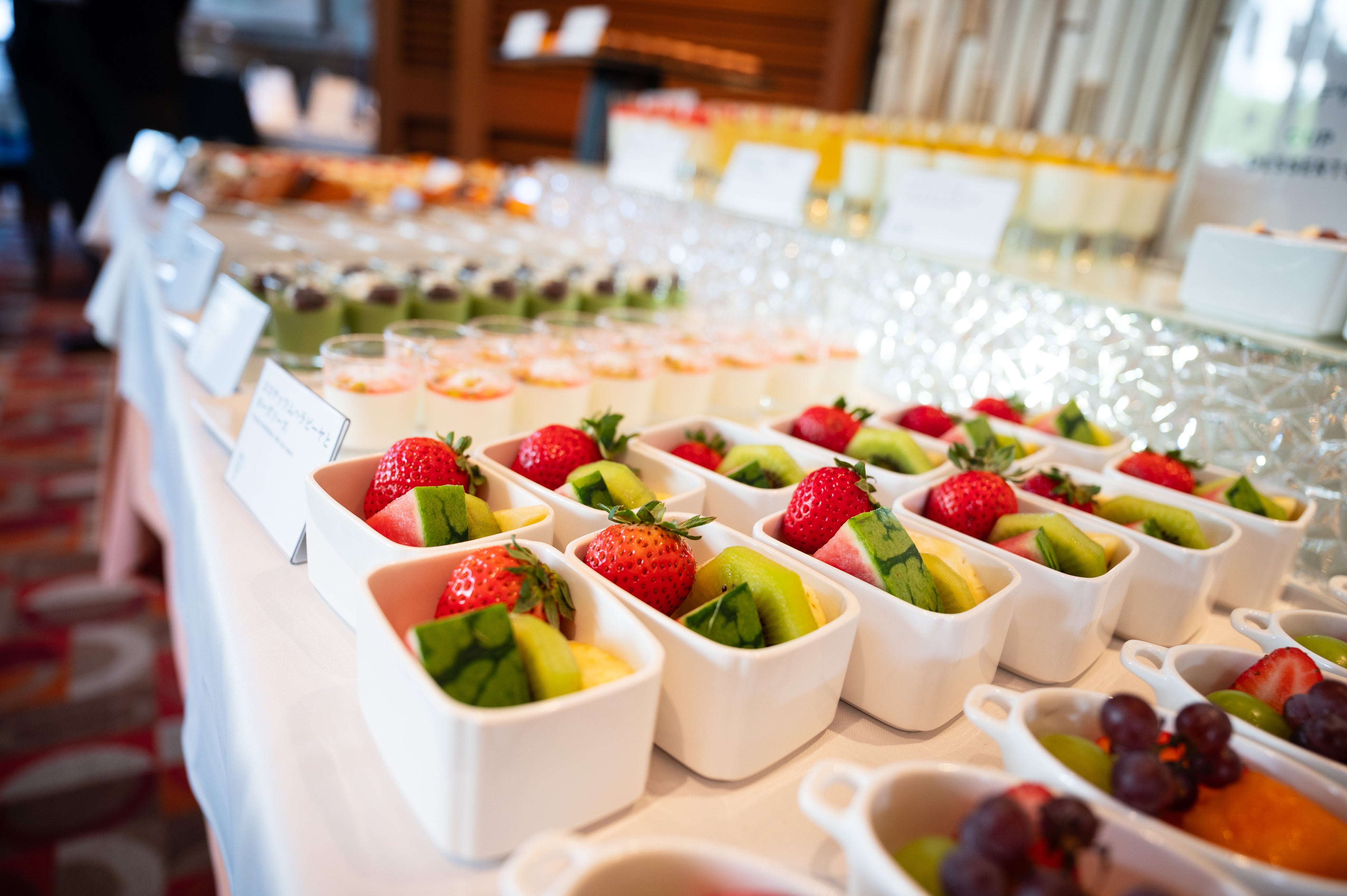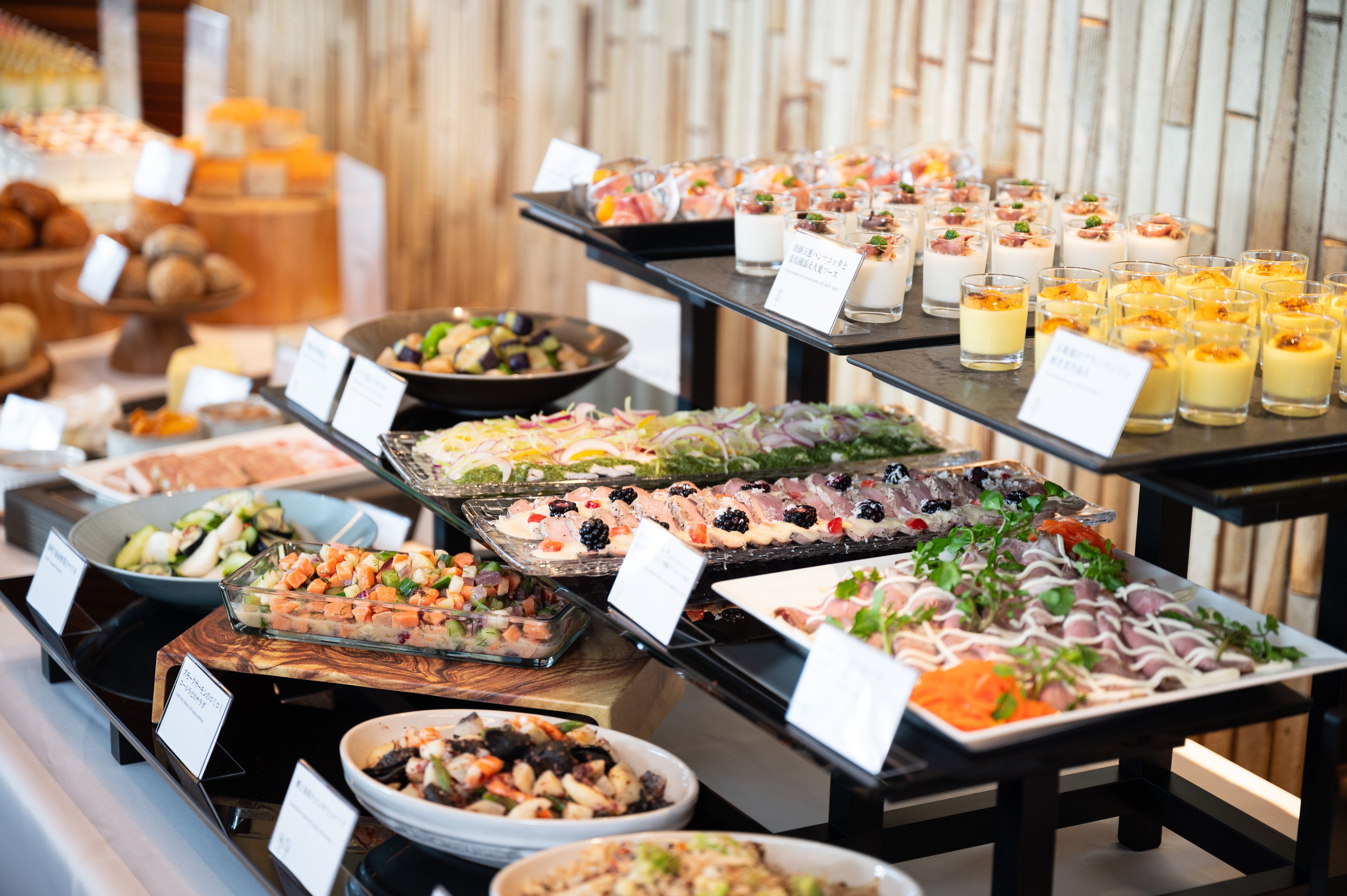 ダイニングエリアでは、地元関西の厳選食材を活かした地産地消の料理を提供するとともに、世界各国の料理をビュッフェ形式で提供いたします。ハラルやビーガン、ベジタリアン対応など、多様なメニューも取り揃え、さまざまな食のニーズにお応えできるよう努めてまいります。