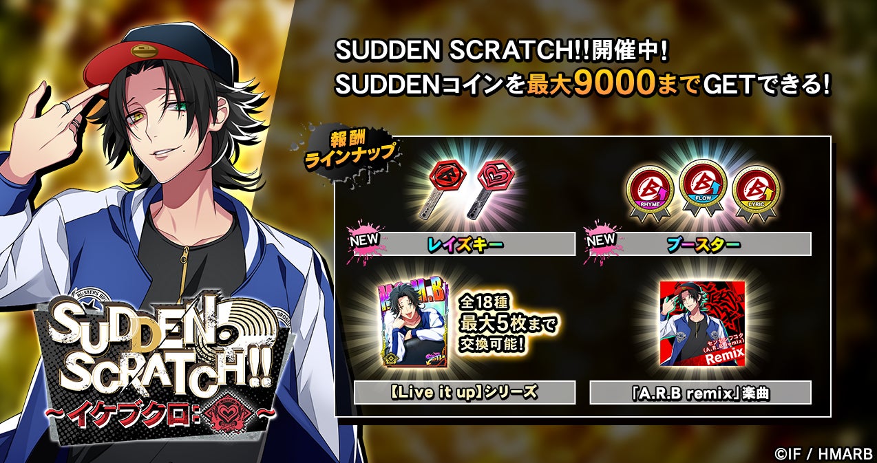 イベント期間中、KILLER SCRATCH!!をプレイするとライズ消費量に応じた確率でSUDDEN SCRATCH!!が発生します。SUDDEN SCRATCH!!をプレイすると、通常の報酬アイテムの他、限定アイテム「SUDDENコイン」を獲得することができます。「SUDDENコイン」を集めることで、レイズキーやイケブクロ・ディビジョンのデコステッカーに使えるブースターなどと交換することが可能です。他にも、ストーリーカードの【Live it up】シリーズ、「A.R.B remix」楽曲などがラインナップされています。