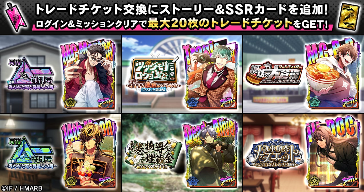 過去に開催されたストーリーイベントの報酬に登場したSSRカードがトレードチケット交換に追加されました。ログインやミッションクリアで、最大20枚のトレードチケットを獲得できるキャンペーンを実施しています。詳細はアプリ内お知らせをご確認ください。