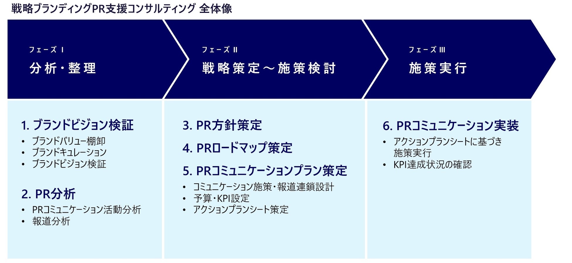 フェーズⅠでは、自社の分析と整理を行います。ブランドビジョン検証においては、ブランドバリュー(経営資源)の棚卸しや、ブランド調査・分析により、現在のブランドのポジションや強み、ブランドが提供する差別化された顧客価値、ブランドの主たるターゲットを第三者の観点から整理。PR分析では、現状のPRコミュニケーション施策をPESOモデルに沿って整理するほか、報道分析により、自社および競合・ベンチマーク企業の報道傾向を把握します。