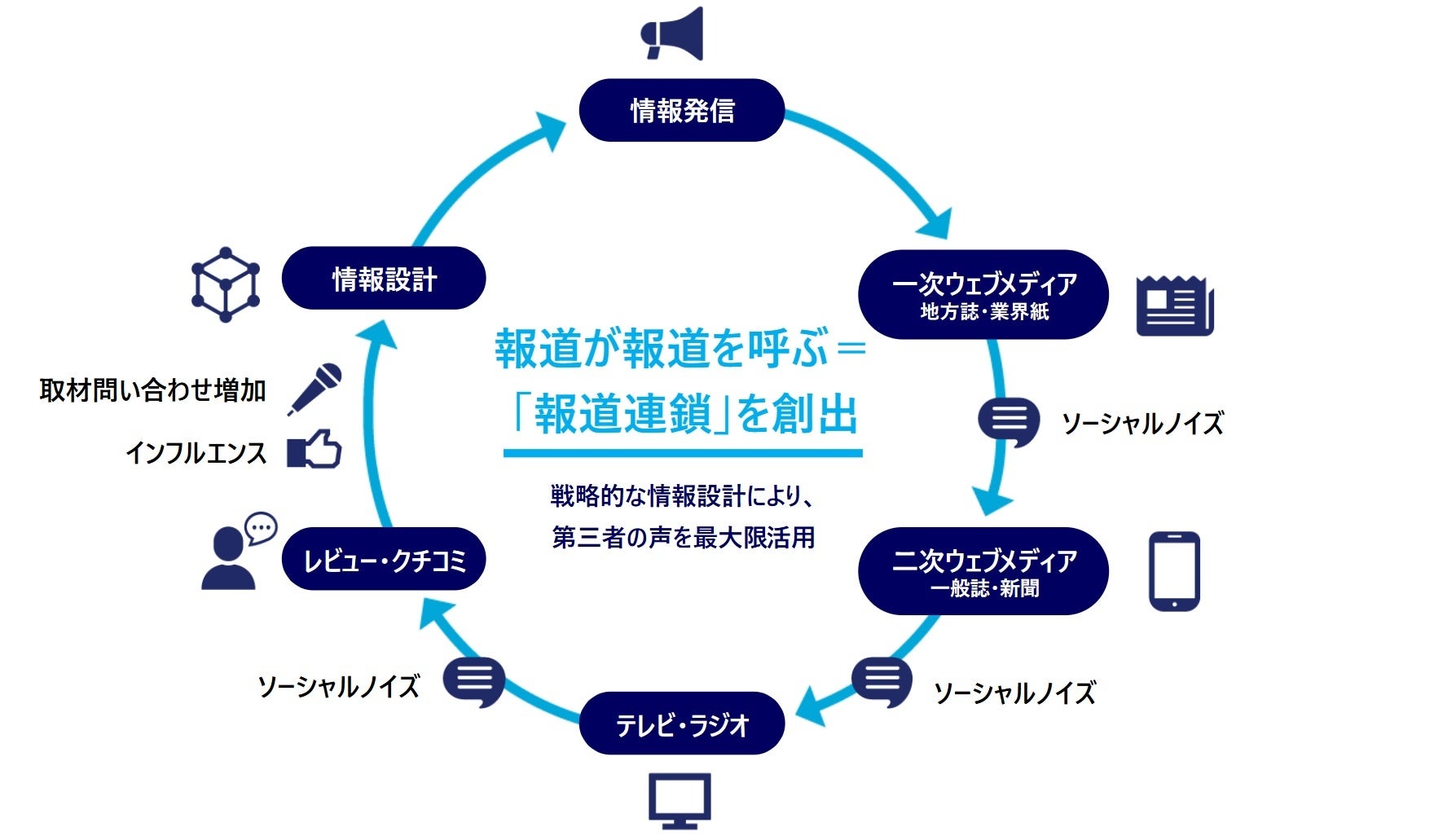 世の中の情報量が爆発的に増え、メディアの多様化と生活様式の変化によって人々の価値観や情報収集の方法が変化してきた今、かつての一方通行型の情報発信は通用しなくなってきています。このような中、今の時代にあった情報発信やコミュニケーションができるPR戦略を新たに構築する必要性が高まっており、ブランディング、PRを経営課題として捉え、一過性のものではない、企業成長に繋がるPR戦略の策定が重要となっています。