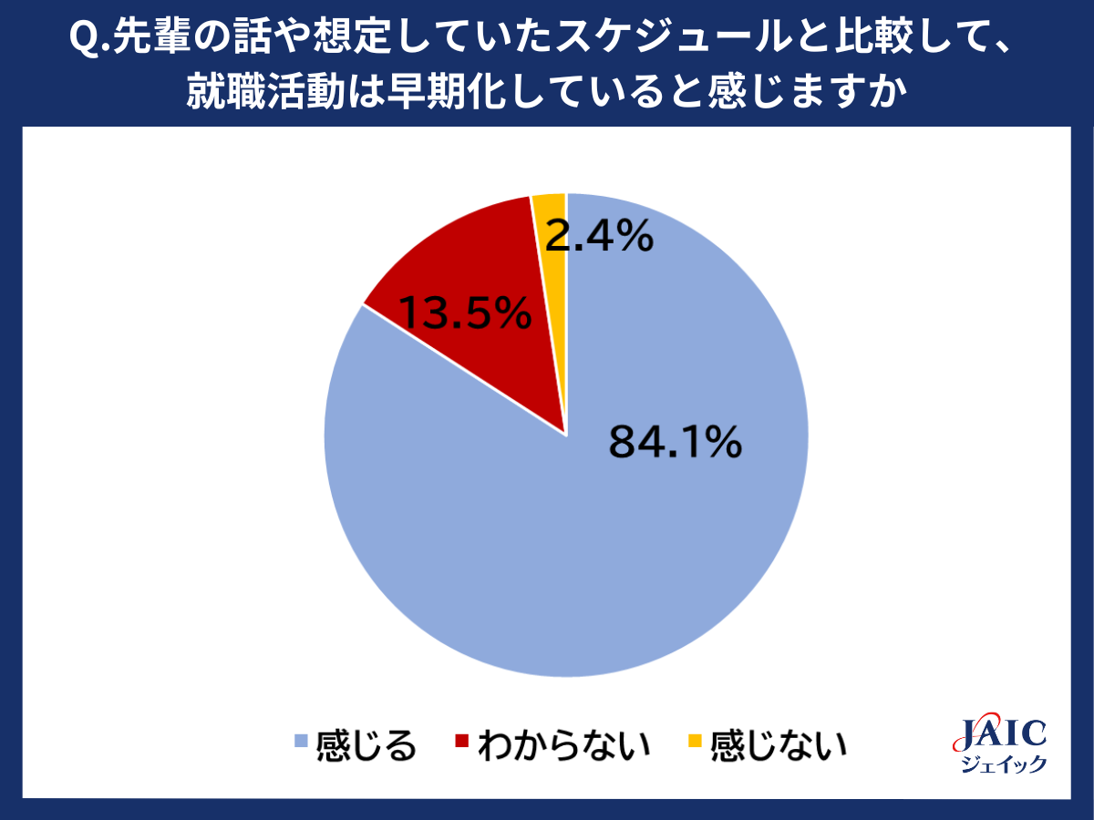 「先輩の話や想定していたスケジュールと比較して、就職活動は早期化していると感じますか」と質問したところ、「感じる」が84.1%、「わからない」が13.5%、「感じない」が2.4%という結果になりました。