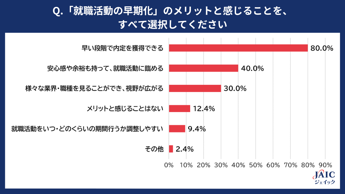 「『就職活動の早期化』のメリットと感じること (複数回答)」を質問したところ、「早い段階で内定を獲得できる」が80.0%、「安心感や余裕も持って、就職活動に臨める」が40.0%、「様々な業界・職種を見ることができ、視野が広がる」が30.0%、「メリットと感じることはない」が12.4%、「就職活動をいつ・どのくらいの期間行うか調整しやすい」が9.4%、「その他」が 2.4%となりました。