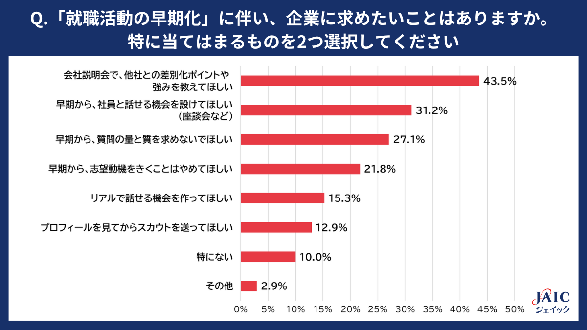 「就職活動の早期化に伴い、企業に求めたいことはありますか(2つ選択)」と質問したところ、「会社説明会で、他社との差別化ポイントや強みを教えてほしい」が43.5%と最多となりました。続いて、「早期から、社員と話せる機会を設けてほしい(座談会など)」が31.2%、「早期から、質問の量と質を求めないでほしい」が27.1%、「早期から、志望動機をきくことはやめてほしい」が21.8%、「リアルで話せる機会を作ってほしい」が15.3%、「プロフィールを見てからスカウトを送ってほしい」が12.9%、「特にない」が10.0%、「その他」が2.9%、という結果になりました。