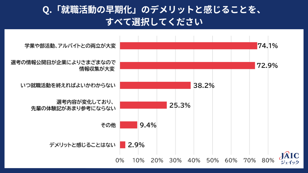 ■就職活動の早期化のデメリット:「学業や部活動、アルバイトとの両立が大変」が最多(74.1%)
