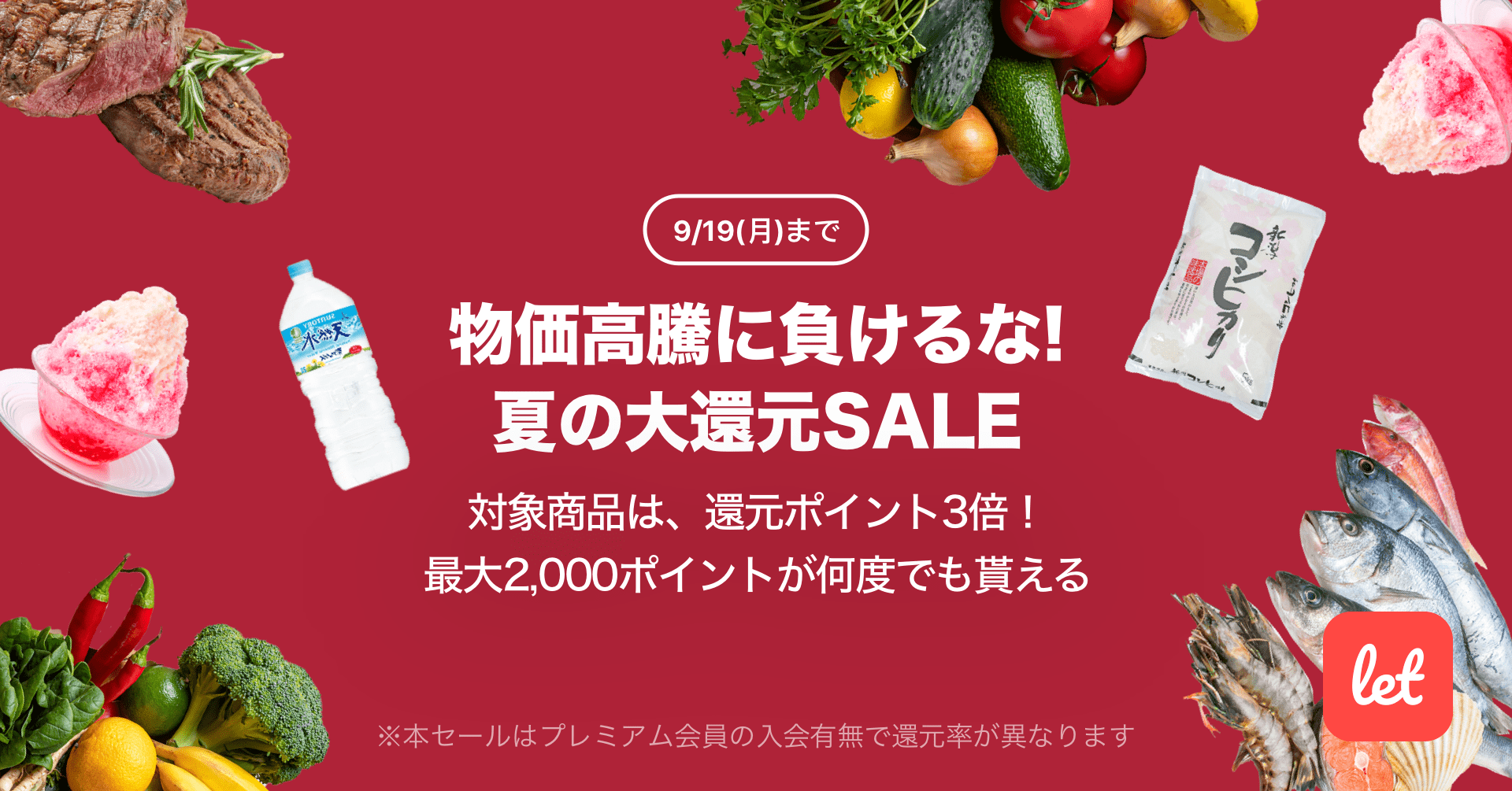 株式会社レット(本社:東京都港区、代表:佐藤 航陽)が運営する、食品ロス/在庫ロス削減のマーケット「Let(レット)」内で「物価高騰に負けるな!夏の大還元SALE」を9月16日(金) 18:00より開催します。期間中、プレミアム会員様限定で対象の食品をご購入いただくと、2,000ポイントを上限に還元ポイントが2倍になります。期間中のご購入であれば、ポイント還元はお一人様あたり何度でもご利用いただけます。