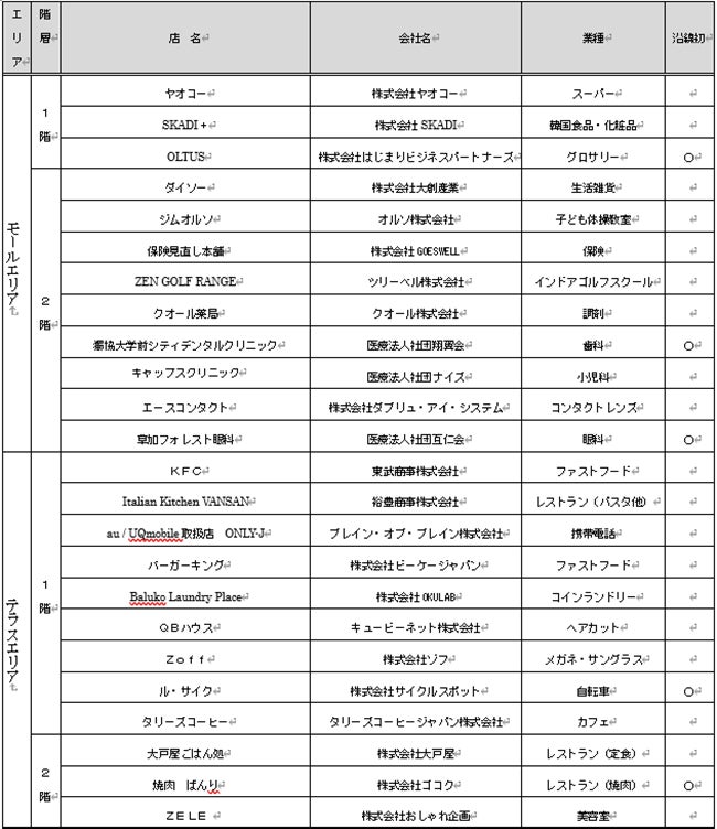 本施設では、獨協大学をはじめとした教育・文化施設や松原団地記念公園などが位置するこのエリアの特徴を活かし、食生活提案型のスーパーマーケットの「ヤオコー」のほか、お客様の多様化するライフスタイルのデイリーニーズを満たす全24店舗が出店します。