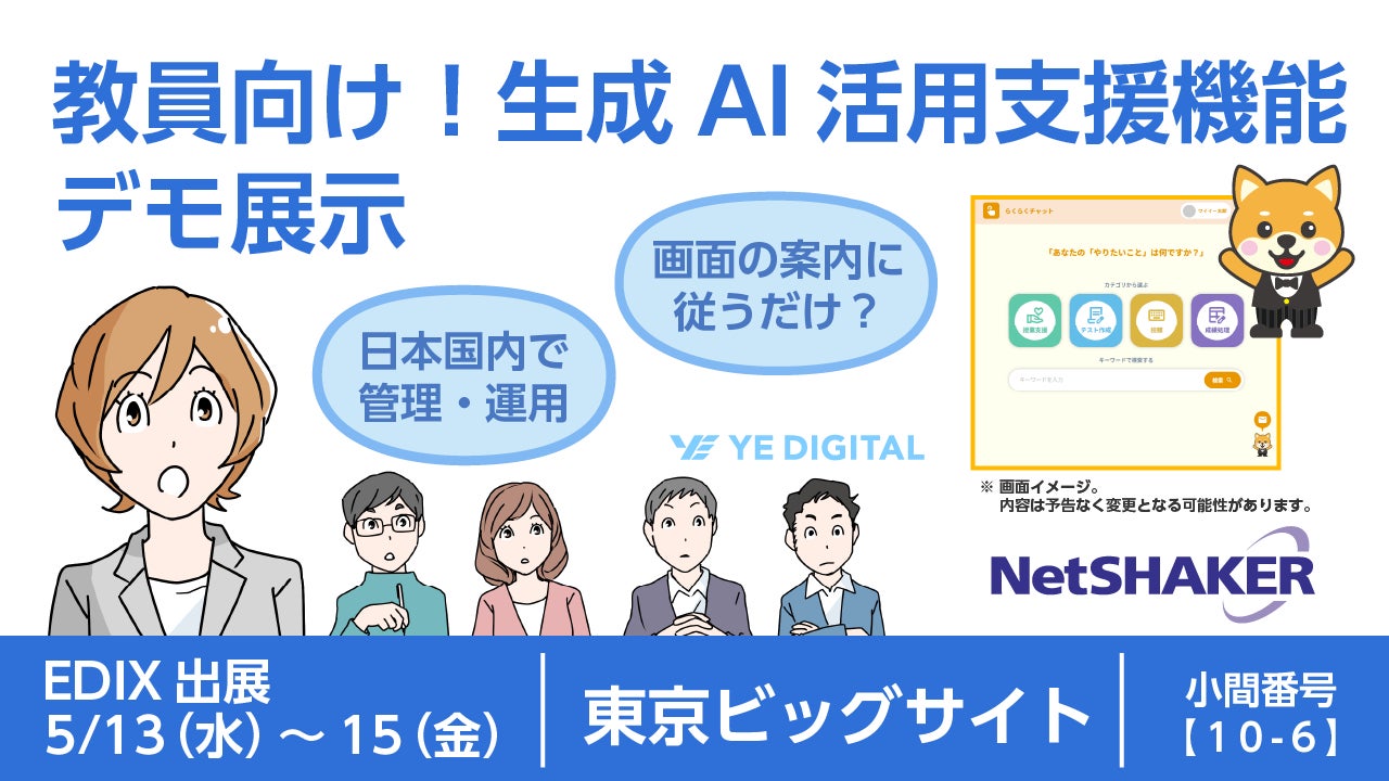 株式会社YE DIGITAL(本社:福岡県北九州市、代表取締役社長:玉井裕治、以下 YEデジタル)は、2026年5月13日(水)から東京ビッグサイトで開催されるEDIX(教育総合展)の同社ブースにおいて、2027年1月に提供開始予定の「教員向けAI活用支援機能」のデモ展示を行います。