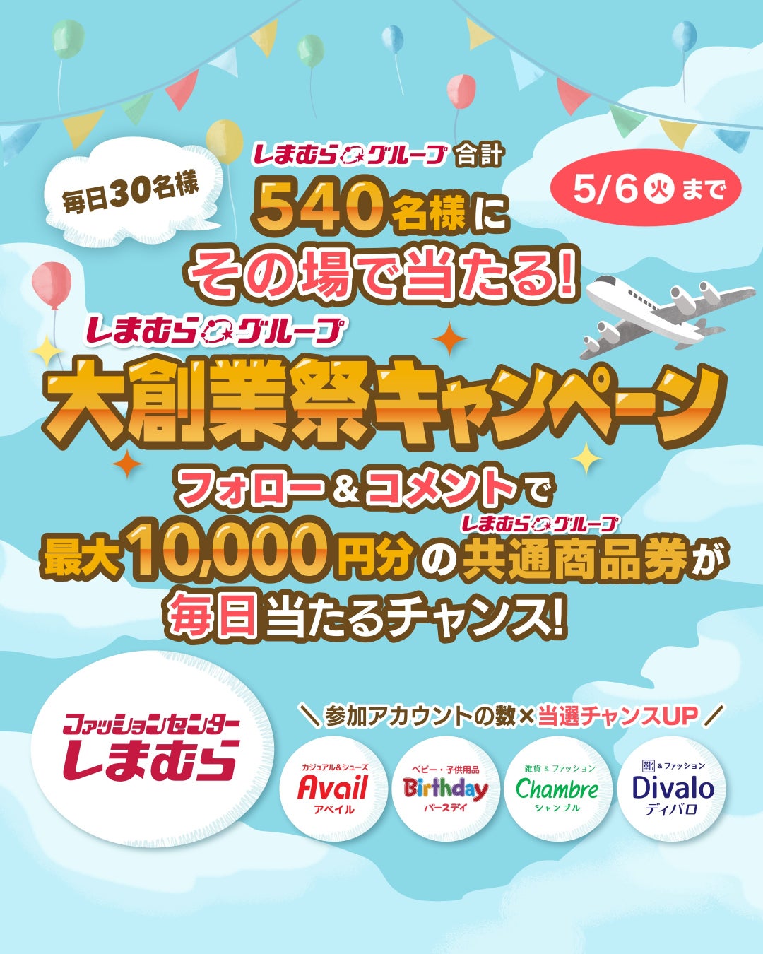 大創業祭開催を記念して、Instagramにてしまむらグループ合計で毎日30名様(期間合計540名様)に抽選でしまむらグループ共通商品券が当たるキャンペーンを実施中です。応募期間は 5/ 6(火)迄です。詳細は、各事業の公式Instagramアカウントをぜひご覧ください!