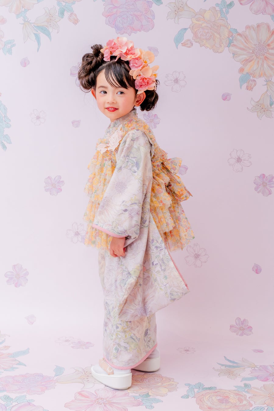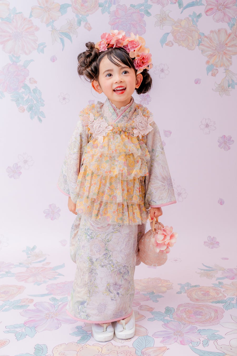 優しい色使いの着物にベッツィ(Betsy)柄のチュールエプロンを合わせました。