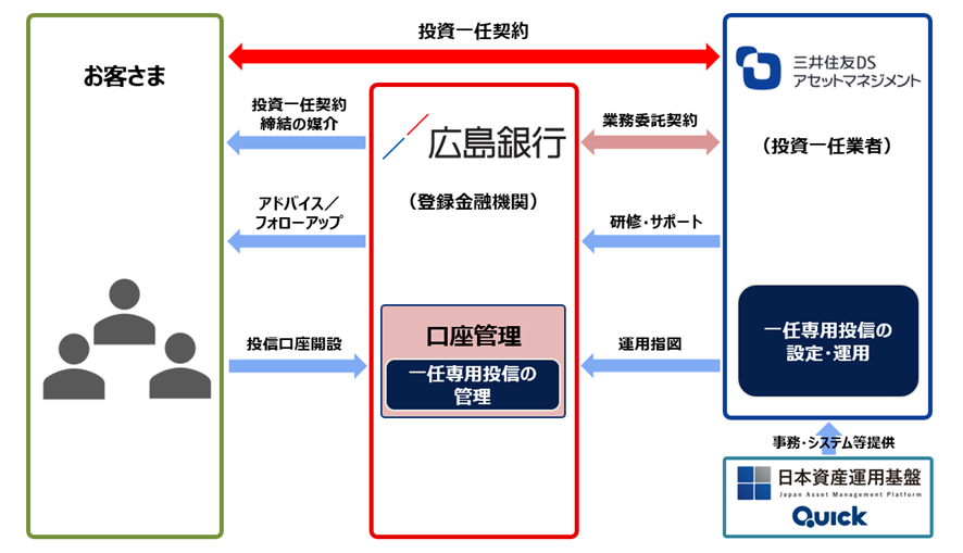 当サービスは、当社がお客さまとの間で投資一任契約を締結し、広島銀行がアドバイザーとして、お客さまのライフプランニーズに合わせた資産運用計画の策定と継続的なフォローアップを行います。また、フォローアップの頻度や内容についてはお客さまとアドバイザーで相談しながら決めていき、お客さま1人1人のファイナンシャルゴールの実現に向けたサポートを行います。なお、サービス運営に係る事務・システムについては、ゴールベース型の資産運用アドバイスサービスに深い知見・経験を有する株式会社日本資産運用基盤グループおよび株式会社QUICKと連携します。