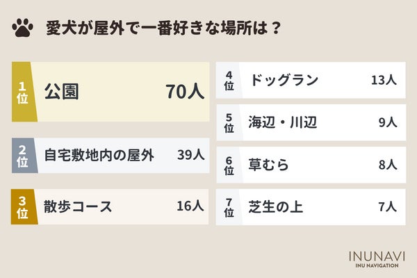 ・犬が屋外で一番好きな場所の1位は「公園」70人と、2位「自宅敷地内の屋外」39人に大きく差をつけた。