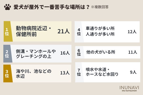 ・犬が屋外で一番苦手な場所の1位は「動物病院近辺・保健所前」21人で、2位「側溝・マンホールやグレーチングの上」16人と小差に。