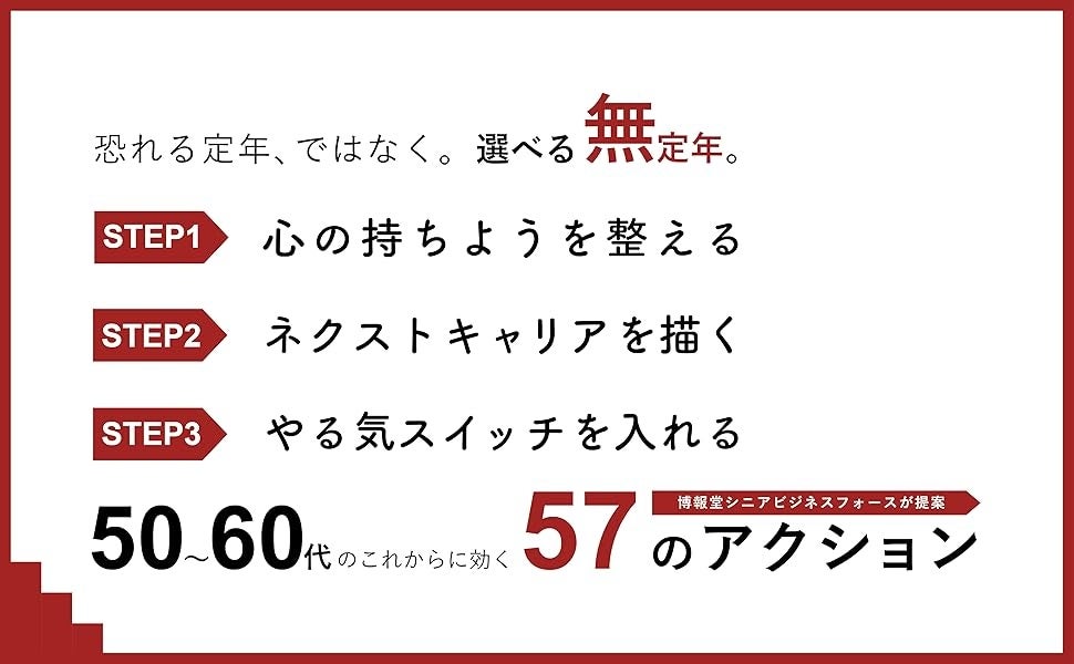 定年後にいきなり何かを始めるのではなく、飲み会やSNSを駆使した「人脈貯金」や、後輩から一目置かれる「ソフト老害」など、50代のうちから小さく準備することや、家庭や地域、職場、たくさんの人に愛される「人気者シニア」、趣味をお金に変える「一人社長」など、60代での社会とのつながり方まで、「無理せず、自分のペースで社会とつながり続ける」ための57のアクションをご提案いたします。
