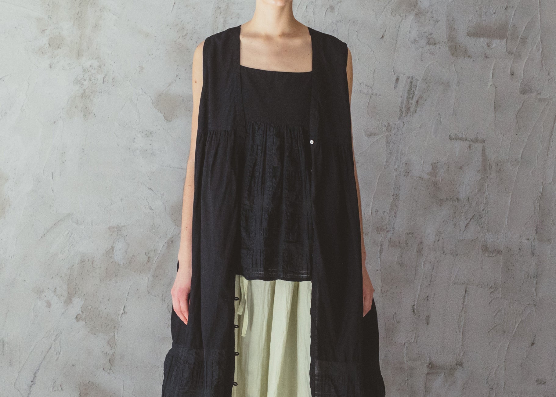 袖が無いタイプのデザインで、インナーにブラウスやニットを着たり、またジャケットとも重ね着がしやすいサイズ感です。フロント部分はくるみボタンが並ぶラウンドネック、バックはVネックデザインと衿元にゆとりのあるデザインで、前後2wayで着用も可能。
