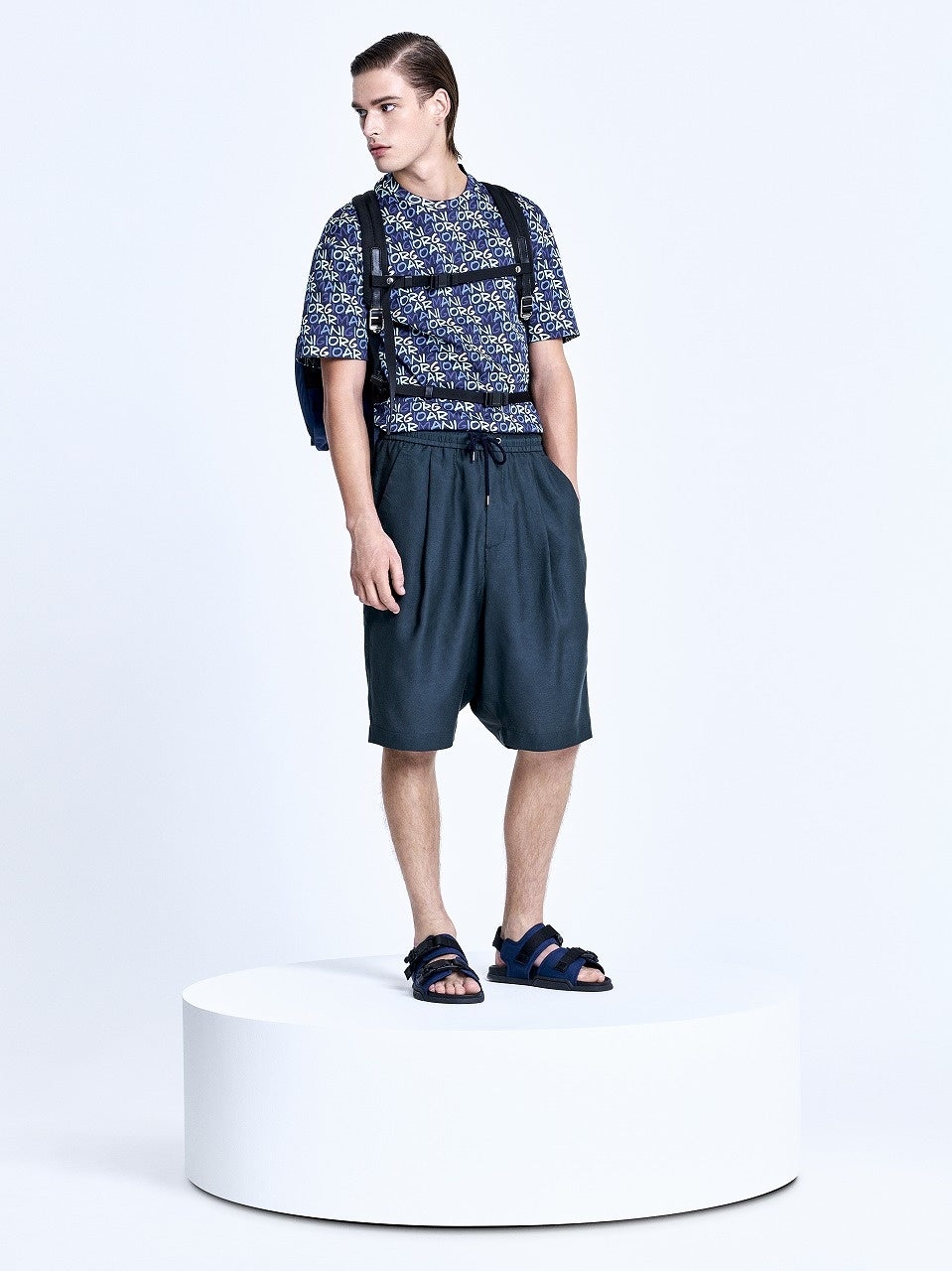 Tシャツもリサイクルキュプラを使用したものが登場。さらりとした肌ざわりが魅力のTシャツは、表身頃はリサイクルキュプラ、裏身頃にはオーガニックコットンが使用されています。オーガニックコットンは、通常のコットンに比べ生産段階において水の使用量が非常に少ない、環境に優しい素材です。かすれたような色合いのグリーン、ベージュ、ブルーを身頃に配し、袖部分はネイビーのソリッドカラーで仕上げました。涼し気な色合いでまとめられた1着は、日本の暑い夏にこそ着用したいアイテムです。
