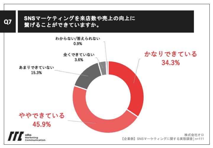 「Q7.SNSマーケティングを来店数や売上の向上に繋げることができていますか。」(n=111)と質問したところ、「かなりできている」が34.3%、「ややできている」が45.9%という回答となりました。
