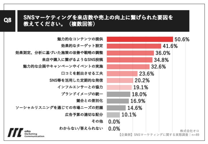 Q7で「かなりできている」「ややできている」と回答した方に、「Q8.SNSマーケティングを来店数や売上の向上に繋げられた要因を教えてください。(複数回答)」(n=89)と質問したところ、「魅力的なコンテンツの提供」が50.6%、「効果的なターゲット設定」が41.6%、「効果測定、分析に基づいた施策の改善や戦略の調整」が36.0%という回答となりました。