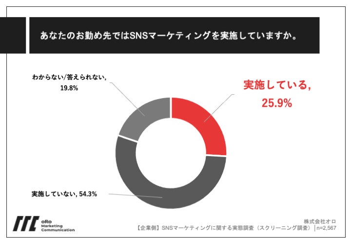 まず、スクリーニング前の会社員(事務系)を対象に「あなたのお勤め先ではSNSマーケティングを実施していますか」と質問したところ、SNSマーケティングを実施している企業は25.9%でした。
