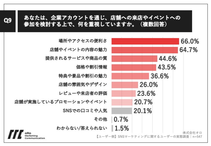 一方、視点を変えて、ユーザー実態を見ると、約7割がSNSを通じて実店舗やオフラインイベントの存在を知ったことがあり、そのうち「企業アカウントの公式ポスト」で知った人は64.7%で最多でした。さらに、そのうちの約6割は、その投稿を見て来店や参加を検討したことがあるとのことでした。また、来店・参加検討時に重視されているのは「場所やアクセスの便利さ」、「店舗やイベントの内容の魅力」が上位だった一方で、「価格や割引情報」、「特典や景品や割引の魅力」など付加的な特典やサービス、割引も一定数重視されていました。