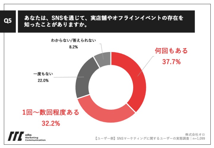 「Q5.あなたは、SNSを通じて、実店舗やオフラインイベントの存在を知ったことがありますか。」(n=1,099)と質問したところ、「何回もある」が37.7%、「1回~数回程度ある」が32.2%という回答となりました。