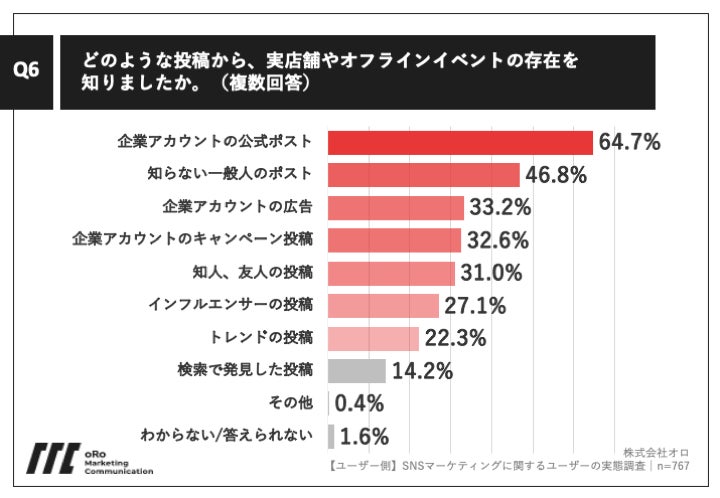 Q5で「何回もある」「1回~数回程度ある」と回答した方に、「Q6.どのような投稿から、実店舗やオフラインイベントの存在を知りましたか。(複数回答)」(n=767)と質問したところ、「企業アカウントの公式ポスト」が64.7%、「知らない一般人のポスト」が46.8%、「企業アカウントの広告」が33.2%という回答となりました。SNSユーザーの情報収集の中で、企業アカウントの公式ポストの存在感は大きいようです。
