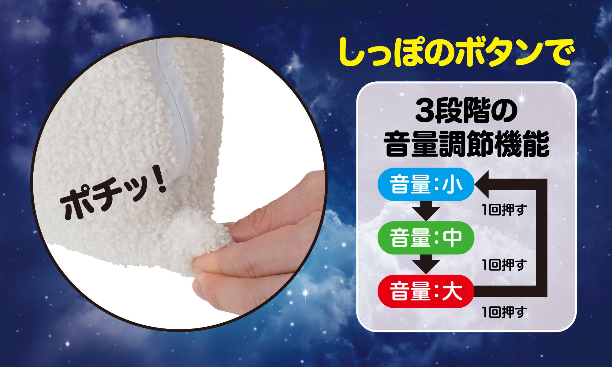 しっぽのボタンで、3段階の音量調節が可能!