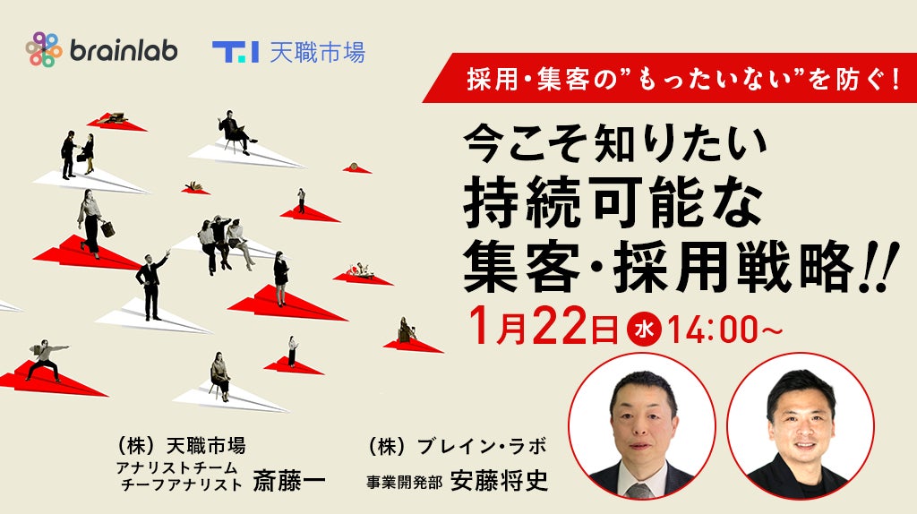 「働く」に関する社会課題をビジネスで解決するキャムコムグループの株式会社天職市場(本社:東京都新宿区、代表取締役:春名敬太 、以下:天職市場)と株式会社ブレイン・ラボ(本社:東京都港区、代表取締役社長:中江典博 、以下:ブレイン・ラボ)は、2025年1月22日(水) 14:00よりオンラインセミナー『(集客費高騰にお悩みの人材派遣・紹介会社様向け)採用・集客の”もったいない”を防ぐ!今こそ知りたい持続可能な集客・採用戦略』を共同開催いたします。