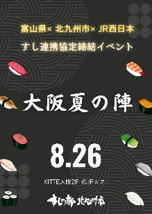 富山県・北九州市・JR西日本の三者連携協定を記念して、北九州市と富山県のすしを大阪で振る舞うイベントの開催が決定しました!6月12日に富山県で開催された世界初の「すし会談」にて「すしの都 北九州市」を掲げる北九州市と、「寿司といえば、富山」のブランディングを推進する富山県とで交わされた“すしのゴールデンルートをつくる”という構想への記念すべき第一歩です!