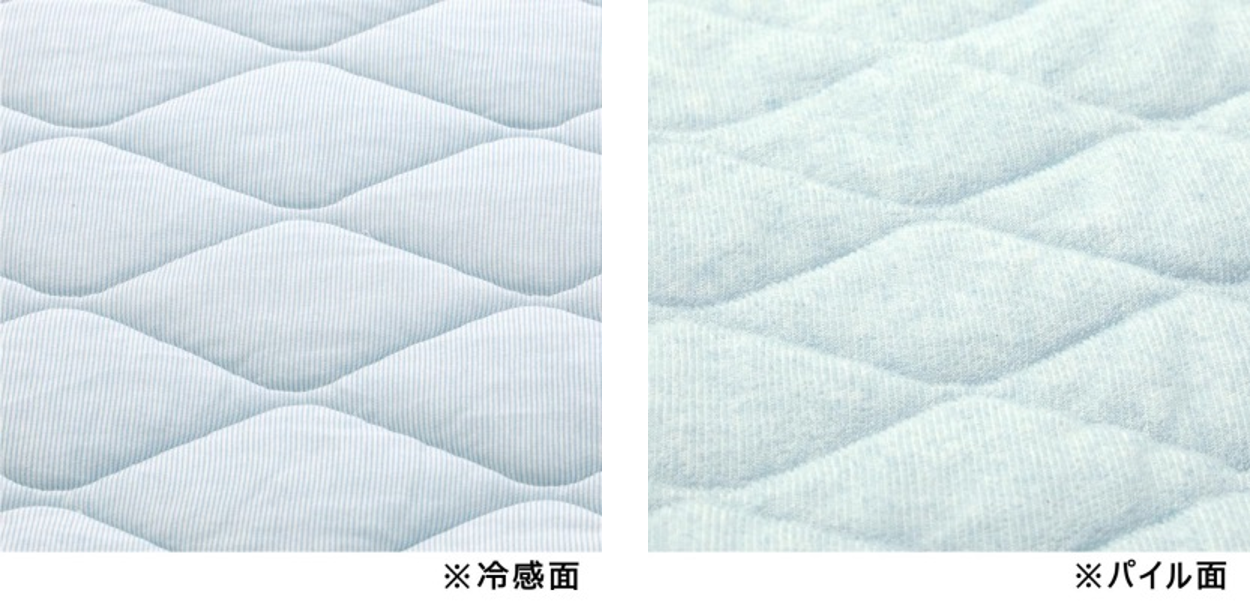 「冷感面」は吸湿性・放湿性が高く、「綿混パイル面」は吸水速乾に優れています。夏場の暑い時期には「冷感面」、春・秋などの季節の変わり目には「綿混パイル面」を使用することで長い期間お使いいただけます。