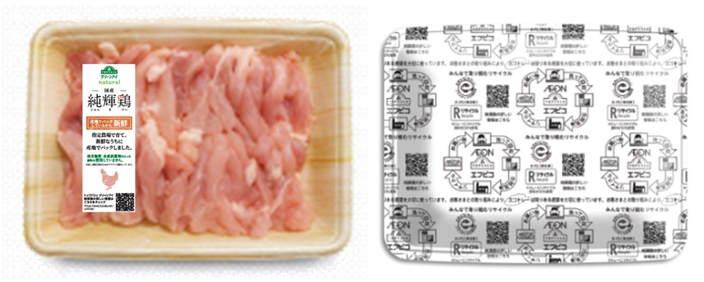 このフェアにおいて、エフピコはイオンと協力し、リサイクルの取り組みをわかりやすく表現した限定デザインのトレーを流通させています。このトレーは、イオンの店頭で回収された使用済み食品トレーをエフピコが容器包材メーカーとしてリサイクルし、再び商品のトレーとして使用するものです。イオンは、この限定トレーをトップバリュ グリーンアイ ナチュラル純輝鶏(じゅんきけい)の販売に使用しています。
