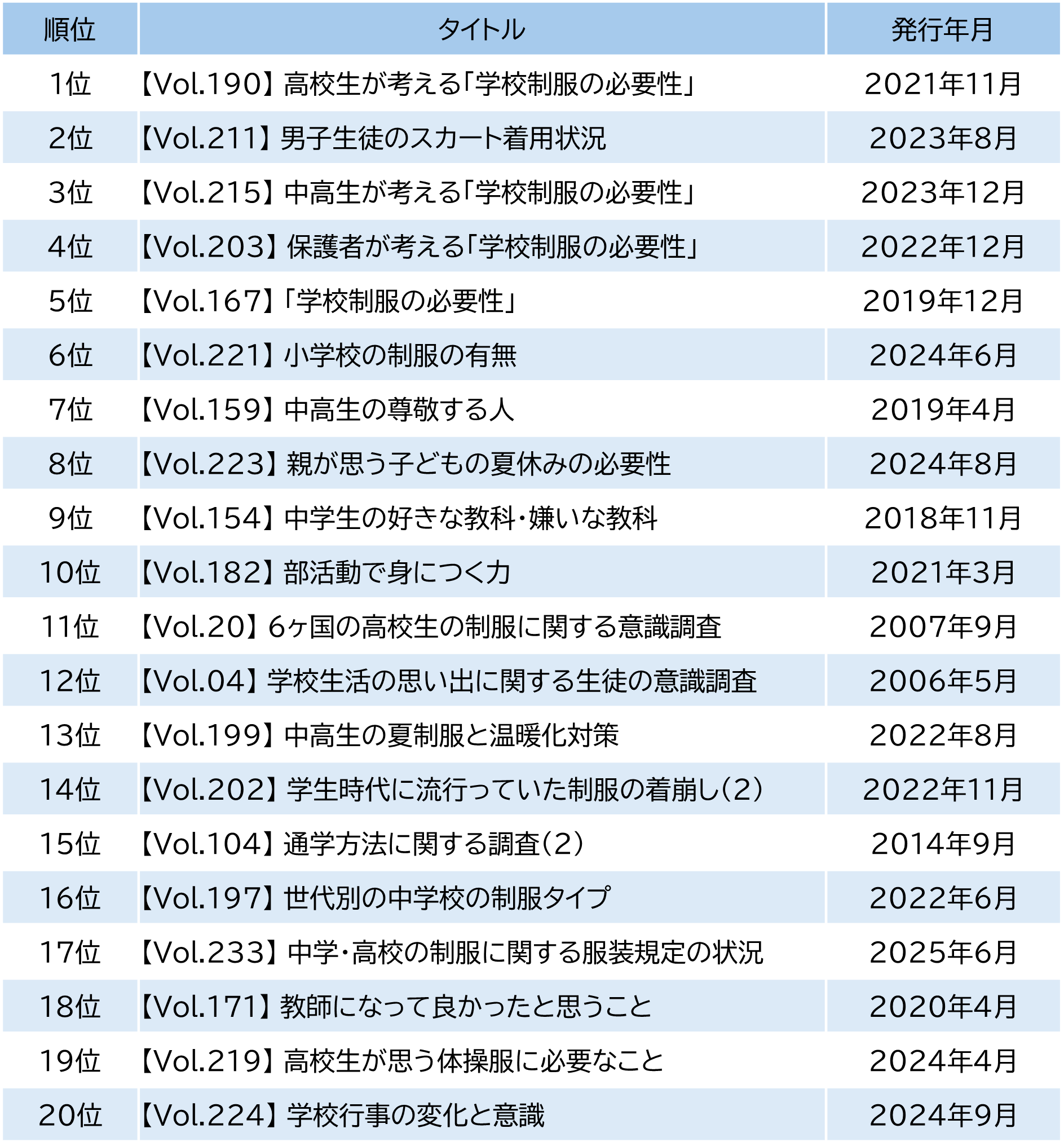 ランキング上位を占めたのは、「学校制服の必要性」に関するテーマ。生徒・保護者・世代別など多角的な視点からの調査記事が、現代の教育現場や社会の価値観の変化を反映し、多くの読者の関心を集めました。