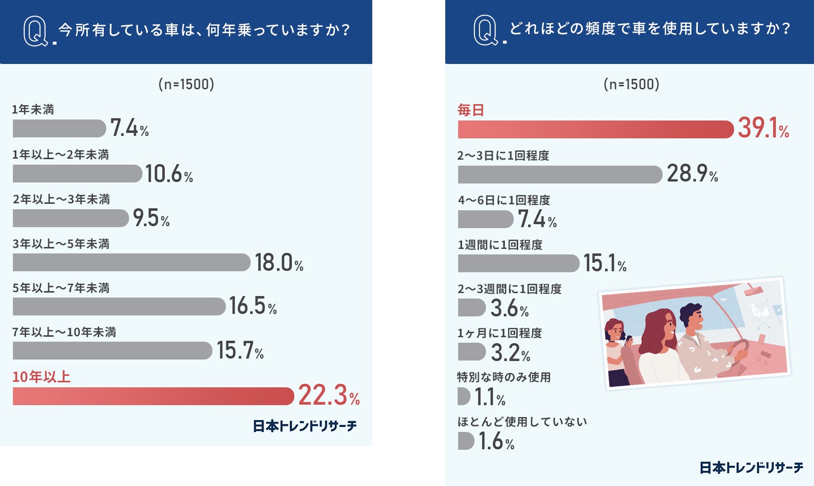 まずは、今所有している車は何年乗っているか、現在どれほどの頻度で車を使用しているかについて聞きました。