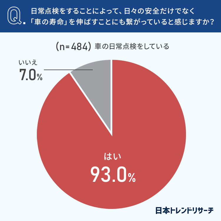 日常点検をすることによって、日々の安全だけでなく「車の寿命」を延ばすことにも繋がっていると感じるかの問いでは、93%が「はい」と回答しました。
