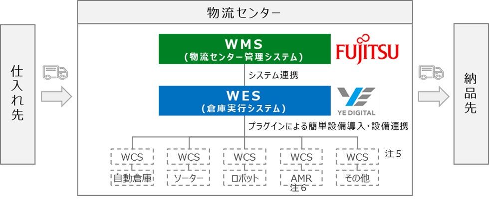 本合意を受けて、富士通の物流センターの業務全般を効率化するWMS(注3)関連サービスとYEデジタルの倉庫業務を自動化するWES(注4)「MMLogiStation」を、物流事業に携わるお客様へ提供します。また、富士通は物流センター構築の企画支援、および既存センター内の業務改革に向けた計画策定などを幅広く支援することで、物流センター業務における自動化設備の導入障壁を軽減するとともに、設備の統合管理により業務の自動化と効率化を促進し、物流センターのパフォーマンス向上を実現します。