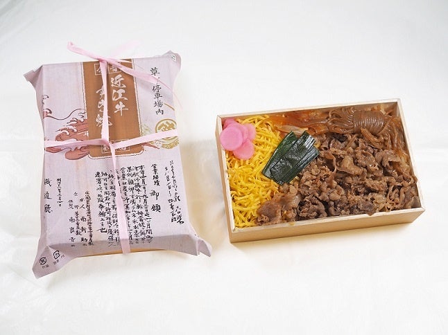 滋賀のブランド牛「近江牛」を昔ながらの容器や掛け紙でシンプルに仕上げたお弁当。近江牛、日の菜漬けなど郷土料理(食材)を詰めました。
