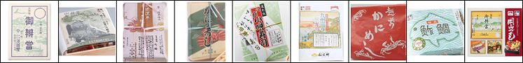 九州7県の食材を盛り付け。7県をイメージした食材を食することで九州を満喫。昭和初期の掛け紙を使用。